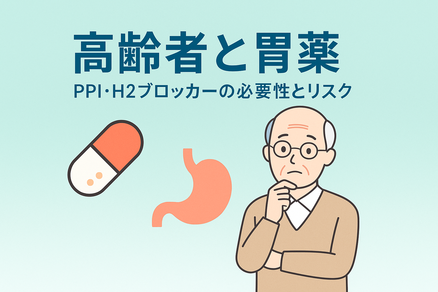 くすり 高齢者に胃酸分泌抑制薬(PPI・H2ブロッカー)が多い理由と長期使用のリスク 高齢者に胃酸分泌抑制薬(PPI・H2ブロッカー)が多い理由を解説。病気や薬の影響で必要とされる一方、長期使用による骨折・感染・栄養障害などのリスクも。必要性と注意点をわかりやすくまとめました。 2025.10.09 くすり勉強