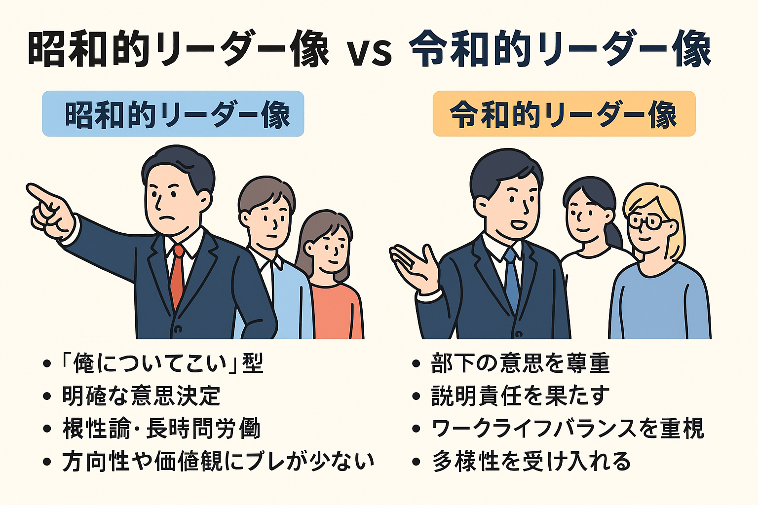 生活 ワークライフバランスから考える令和時代のリーダー像とは? 昭和の「俺についてこい」型リーダーと、令和の「共感・柔軟性」を重視するリーダー像を比較。ワークライフバランス時代に求められる“ハイブリッド型リーダー”の姿を解説します。 2025.10.10 生活