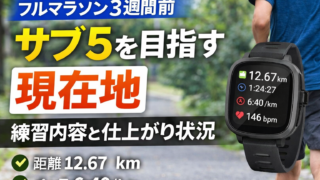 フルマラソン3週間前、サブ5達成を目指す現在の練習内容と仕上がり状況を公開。心拍管理・ピッチ改善・疲労を残さない調整方法までリアルにまとめました。